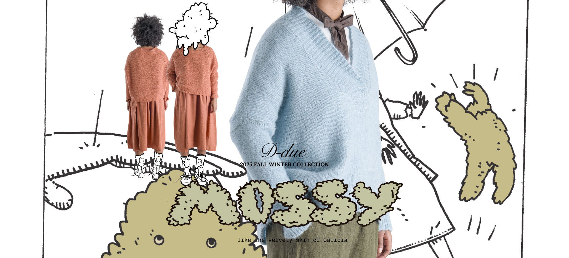 オートクチュールのように細部までこだわったデザイン、アートのようなテキスタイル、緻密なパターンメイキングによる着心地のよさがD-dueの魅力。ブランド名は「ダブルミーニング(二重の意味)」を示し、ひとつの視点にとどまらない自由な発想から、毎シーズン豊かなストーリー性のある服を紡ぎ出しています。