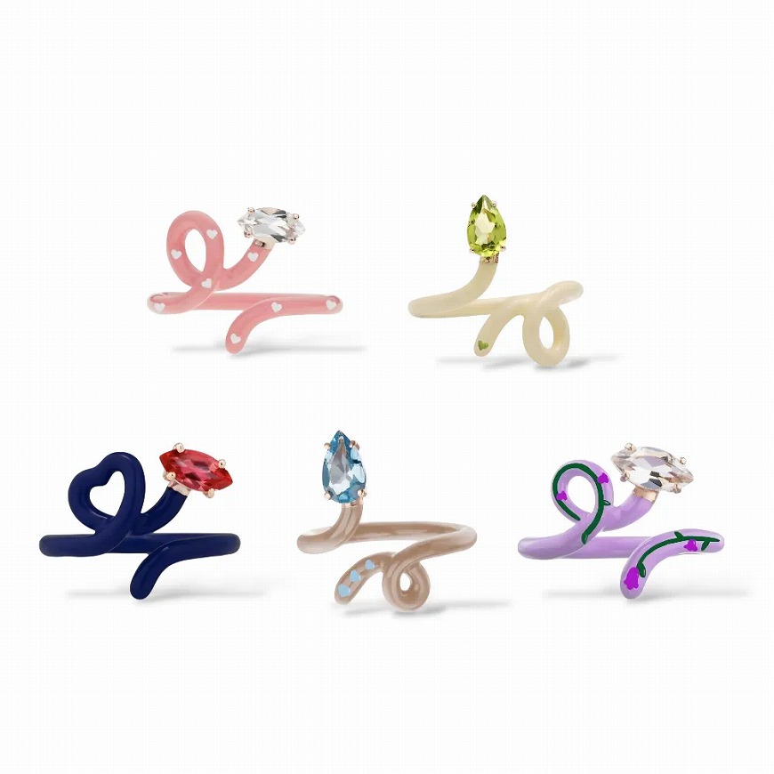 軽やかでありながら大胆、そしてどこかユーモラス。色彩や曲線のリズムに、デザイナーの自由な感性が溢れ、装いにアートのエネルギーを宿します。気分に合わせて色を重ねたり、指先にカラーポップを添えたり。スタイリングに遊び心をプラスするだけで、いつものファッションがぐっと躍動的に。ジュエリーを“楽しむ”という原点へと連れ戻してくれるような、ポジティブなパワーに満ちたブランドです。