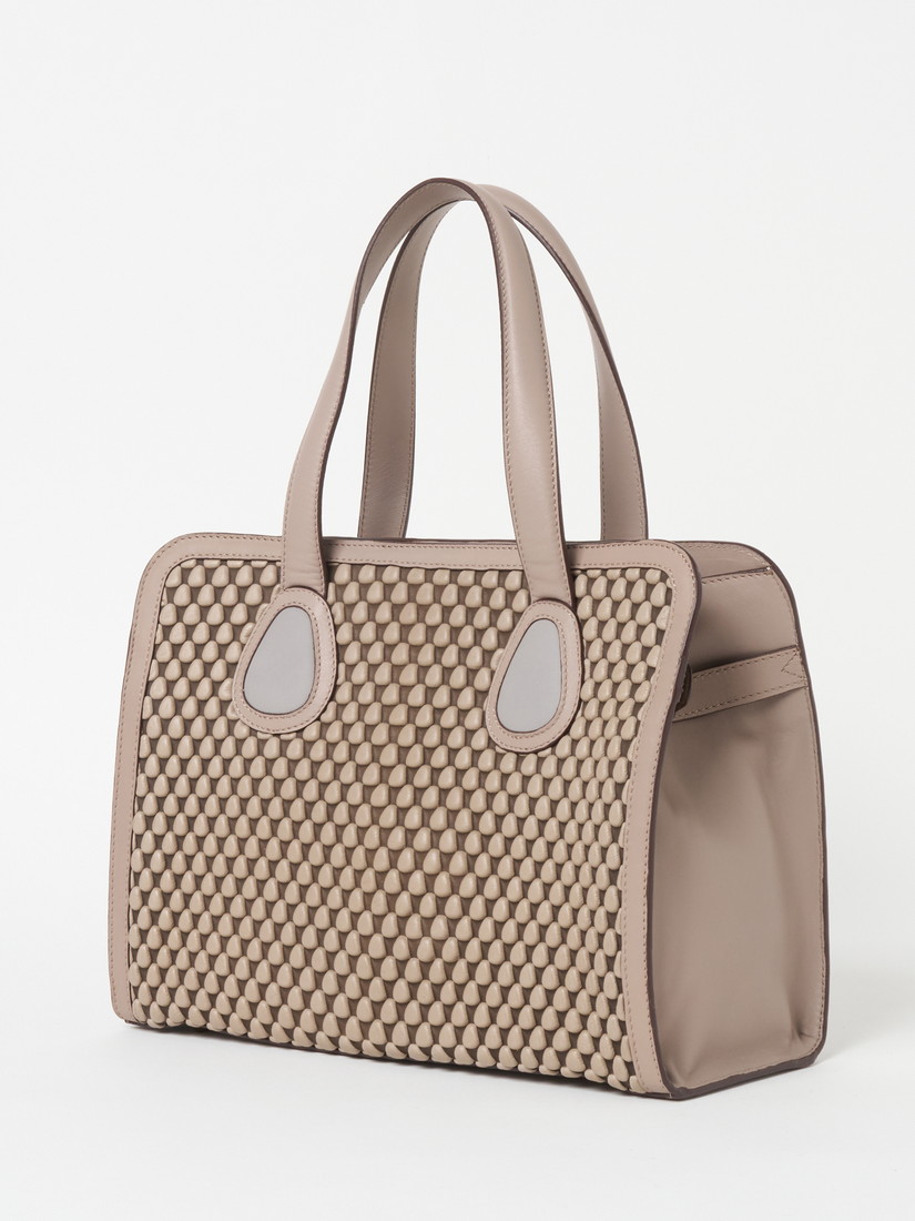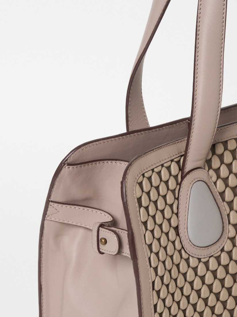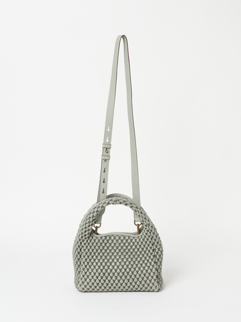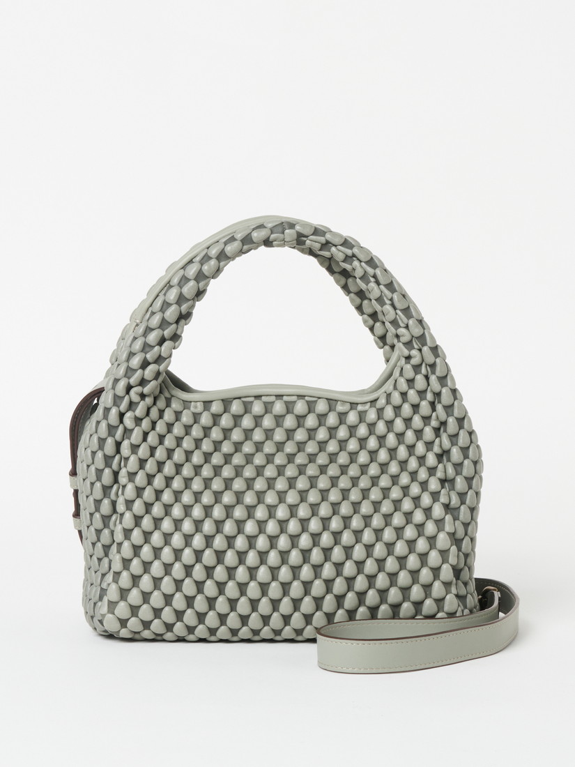 ブランドを象徴する「バブル・バッグ」は、ビロードのように柔らかなスペイン産ラムスキンを使用。熟練の職人たちが一枚一枚手作業で仕上げる、まさにアートピースのような存在です。立体的に浮かび上がる“バブル”の表情が、唯一無二の佇まいを生み出しています。