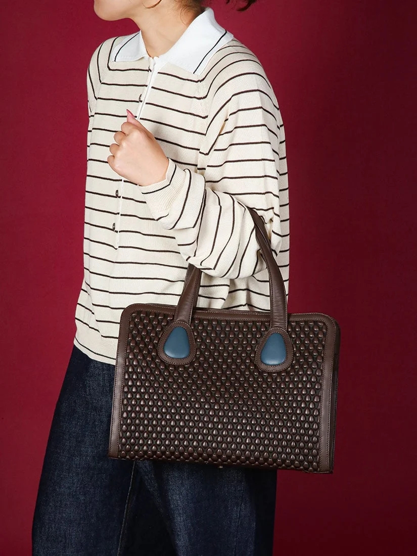 ドット型の特殊なエンボス加工をレザーに施すことにより、華やかでリッチな見た目ながらも、非常に軽く、滑らかな質感を併せ持つ素晴らしい作品に仕上がっています。