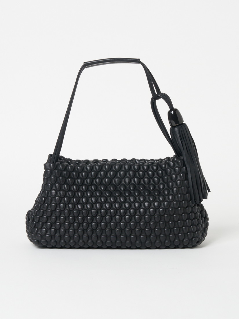 バブルレザーの立体感と、縁取りに施されたフラットなレザーとのコントラストが美しく、洗練された印象を与えます。