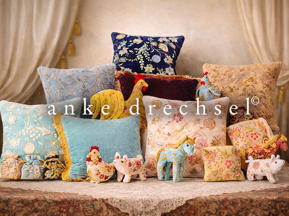 anke drechsel(アンケ・ドレッチェル)は、ドイツ出身デザイナーのアンケ・ドレッチェル氏が手がけるインテリアアクセサリーブランドです。伝統的なヨーロッパのテキスタイルをベースに、精緻な手刺繍やビーズ・スパンコールなどの装飾を施した独創的なデザインを生み出しています。