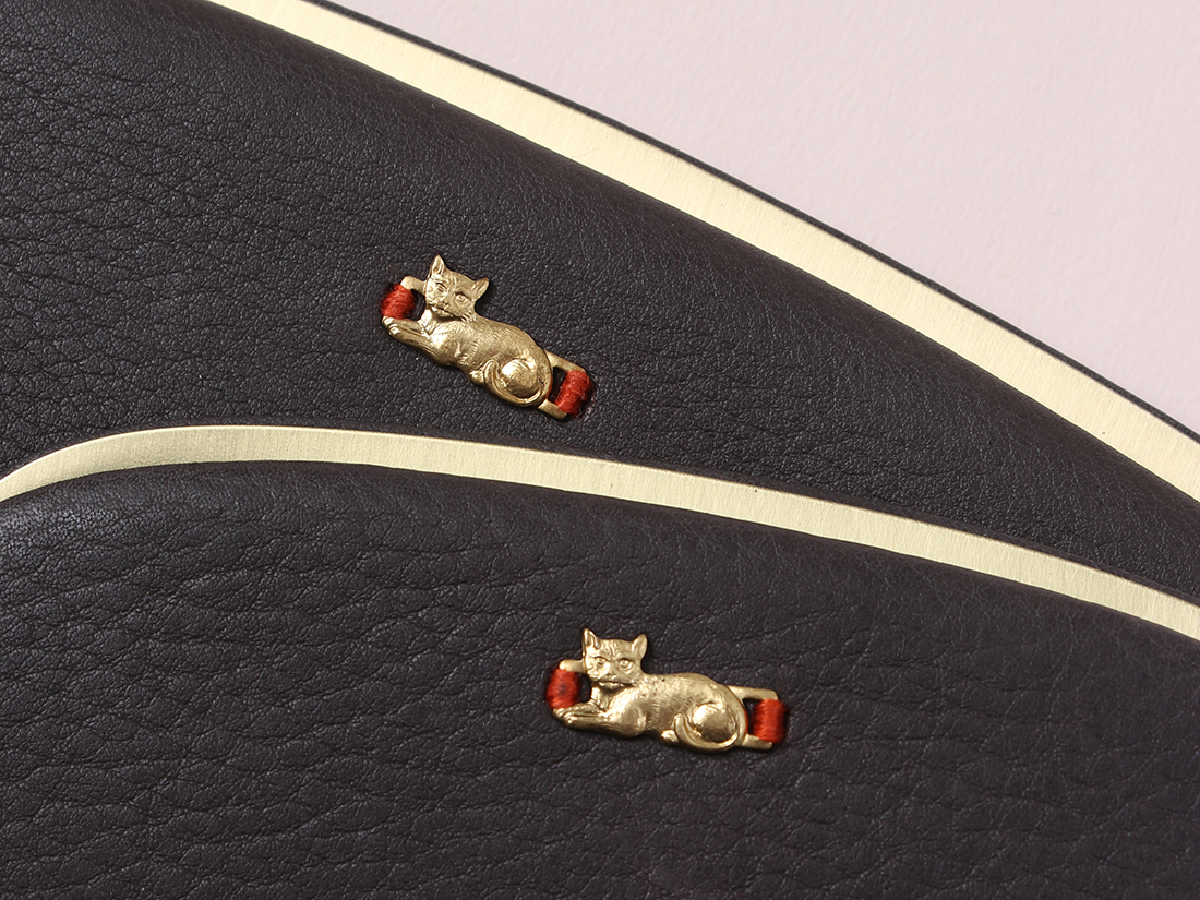フロントにあしらわれた小さな猫モチーフが、静かなかわいらしさを添えます。大人の手元に、そっと寄り添うアクセントに。