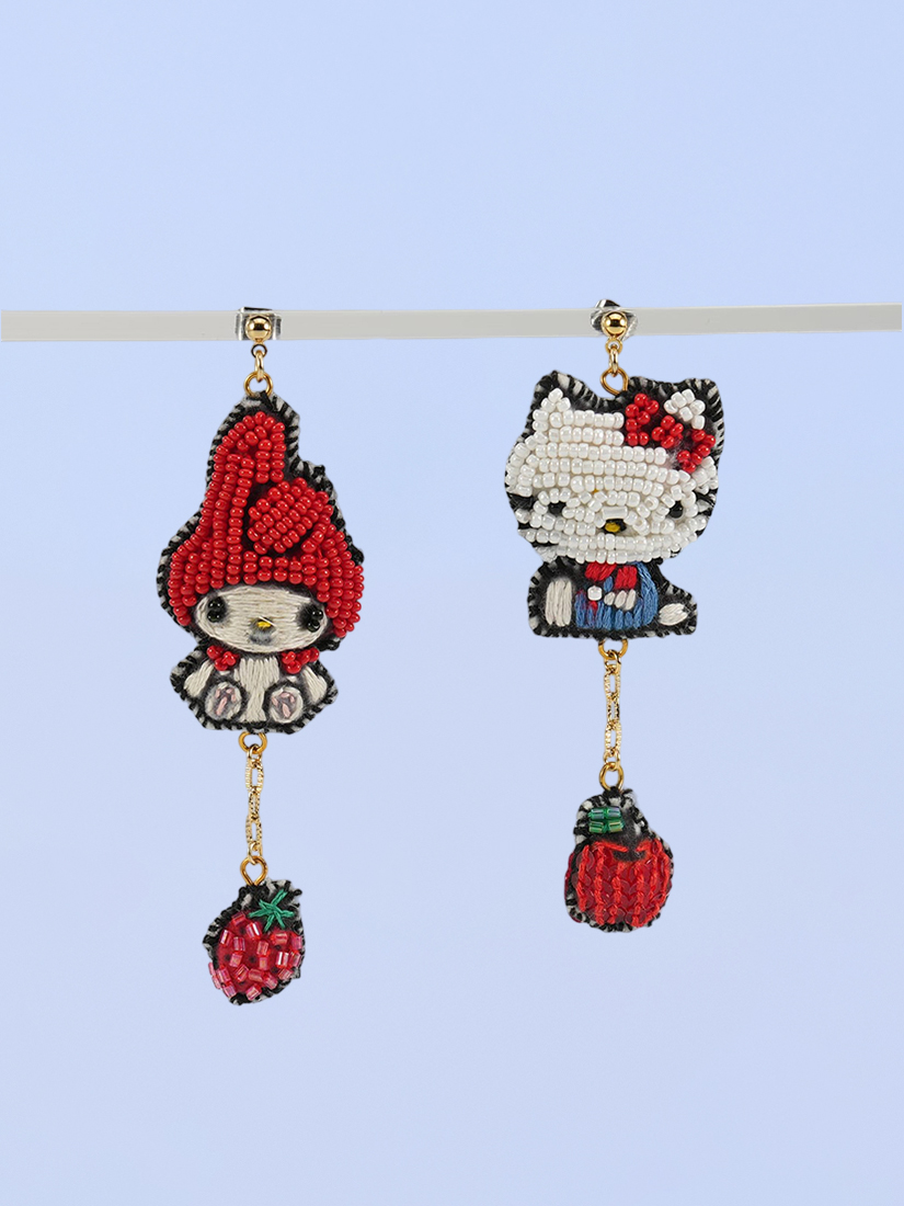 ハローキティとマイメロディそれぞれに合わせた、りんごやイチゴのモチーフがゆらゆらと揺れ、かわいらしいアクセントに。手刺繍ならではの立体感に、ビーズやスパンコールを組み合わせた繊細で温もりのあるデザインです。