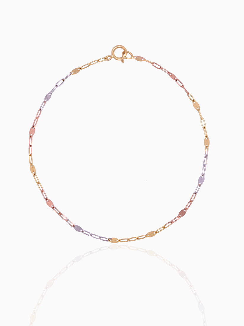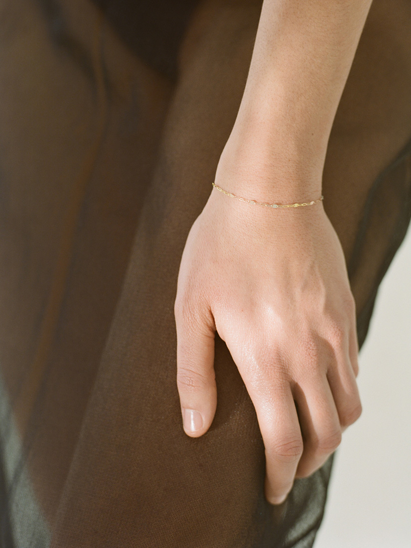 3色の18Kゴールドチェーンを組み合わせたブレスレット。異なる色味の重なりが繊細な光のレイヤーを生み、手元に奥行きと立体感をもたらします。ミニマルでありながら視覚的な強度を持つ一作です。