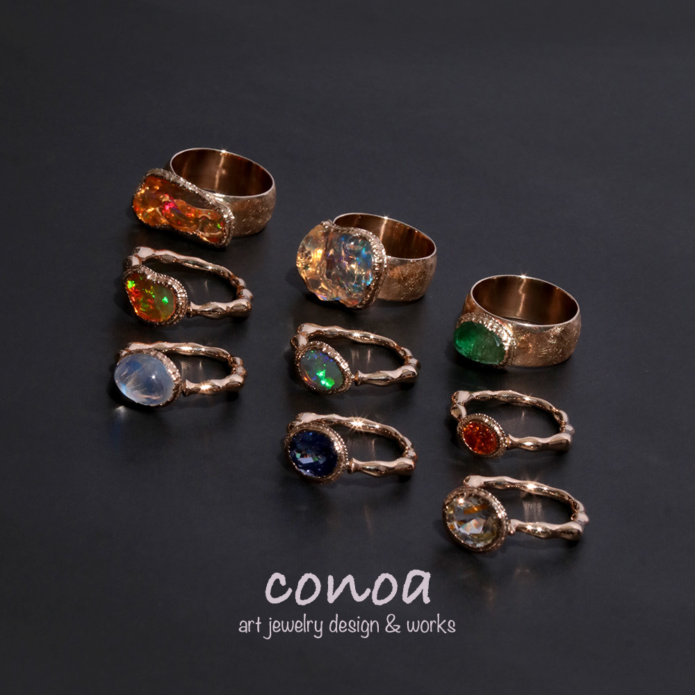 水をテーマに、水が凍りついた一瞬の形をイメージし、 かろやかで儚げで綺麗、着けて、暮らして心地よいMADE IN JAPANジュエリーを制作する"conoa"(コノア)。 オンラインストアに一点ものの天然石ジュエリーが入荷いたしました。