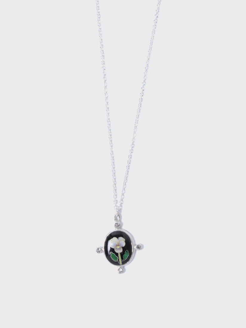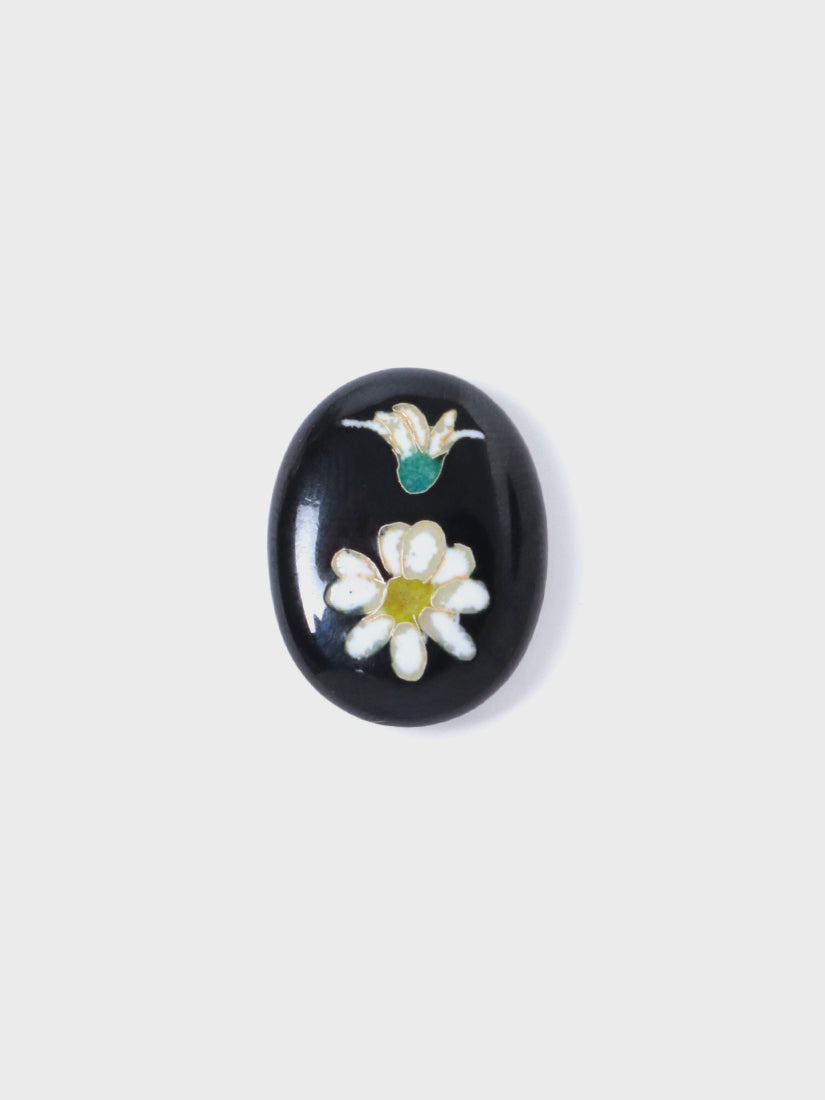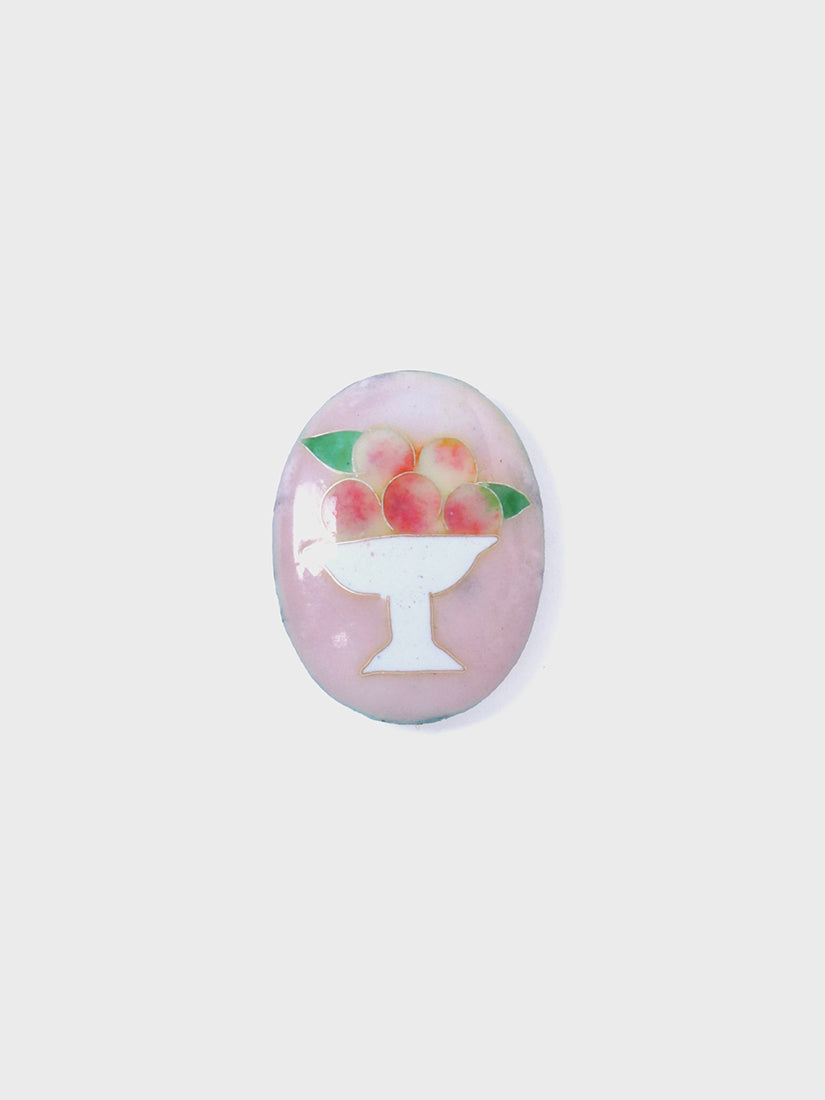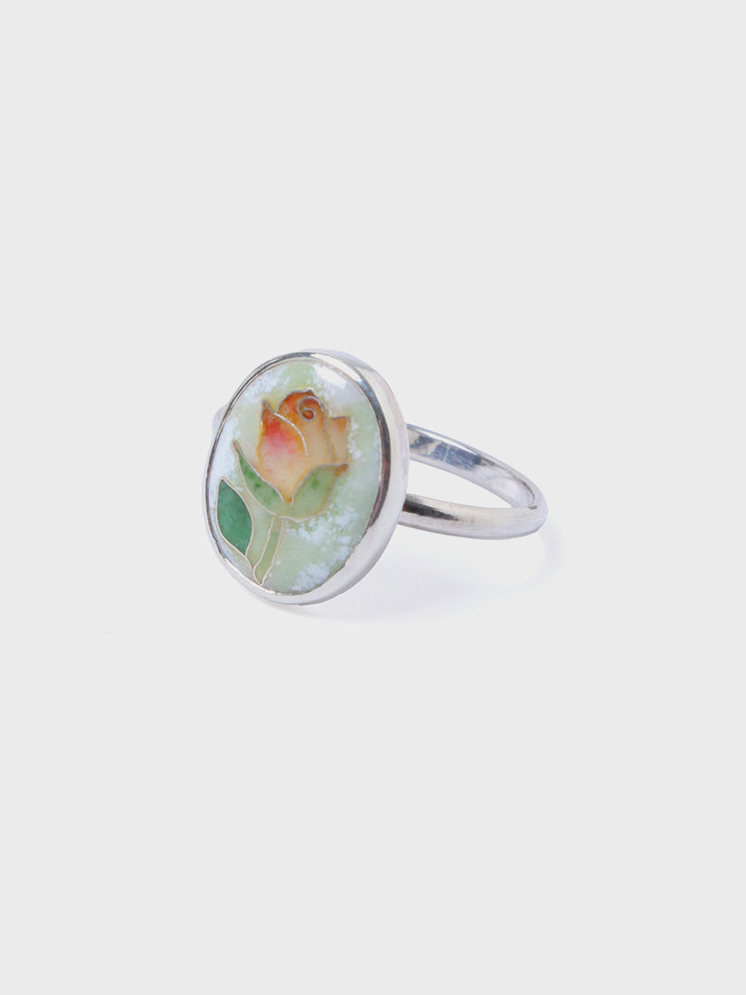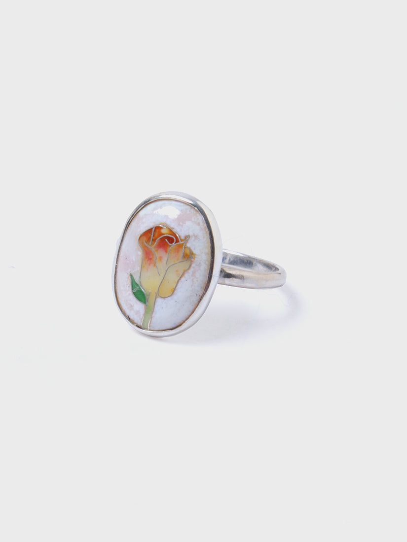 enamel: 銀線をピンセットで曲げて絵柄を描き、その輪郭の中に七宝釉薬(ガラスの粉)を少量ずつ乗せて、700℃前後の釜で焼成します。 透明、不透明の釉薬を重ねては焼く工程を10~20回程繰り返すことで、自然物のような優しく繊細な色合いを生み出しています。