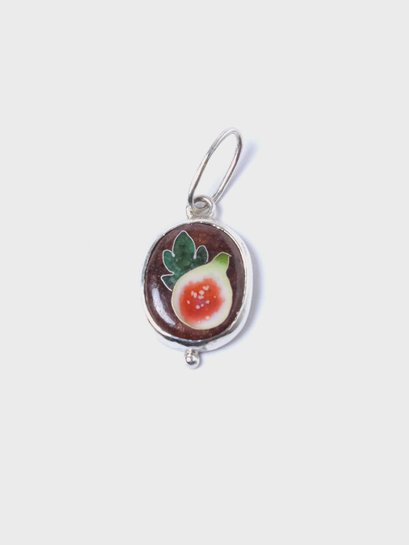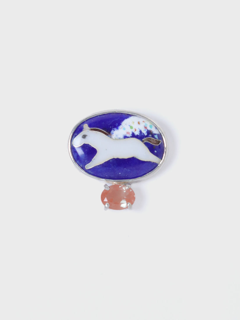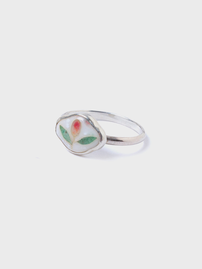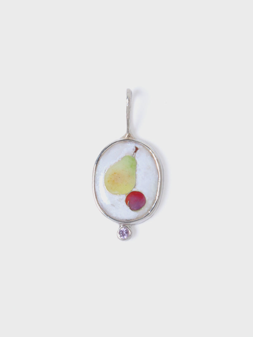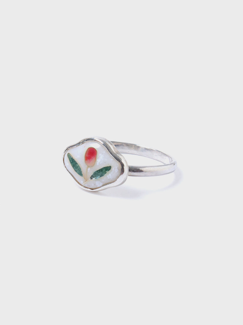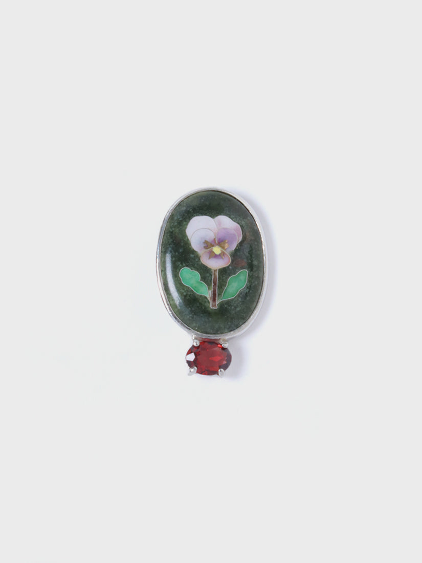 enamel: 銀線をピンセットで曲げて絵柄を描き、その輪郭の中に七宝釉薬(ガラスの粉)を少量ずつ乗せて、700℃前後の釜で焼成します。 透明、不透明の釉薬を重ねては焼く工程を10~20回程繰り返すことで、自然物のような優しく繊細な色合いを生み出しています。