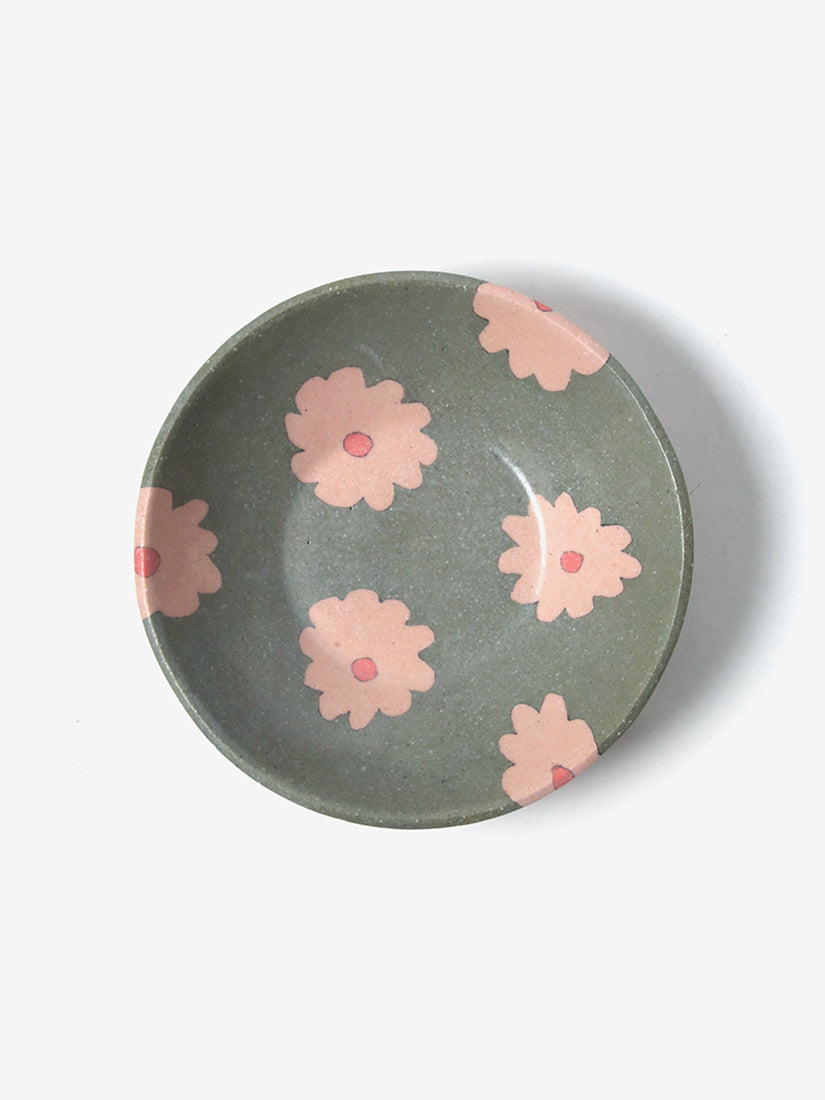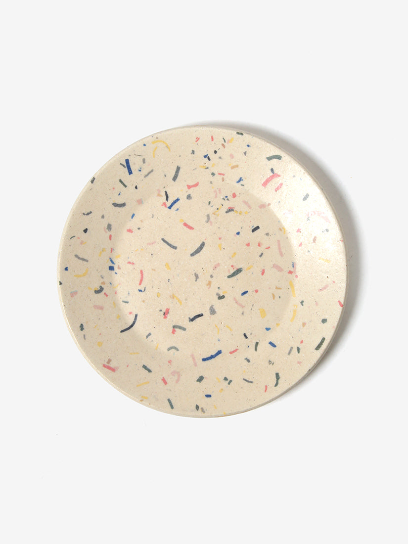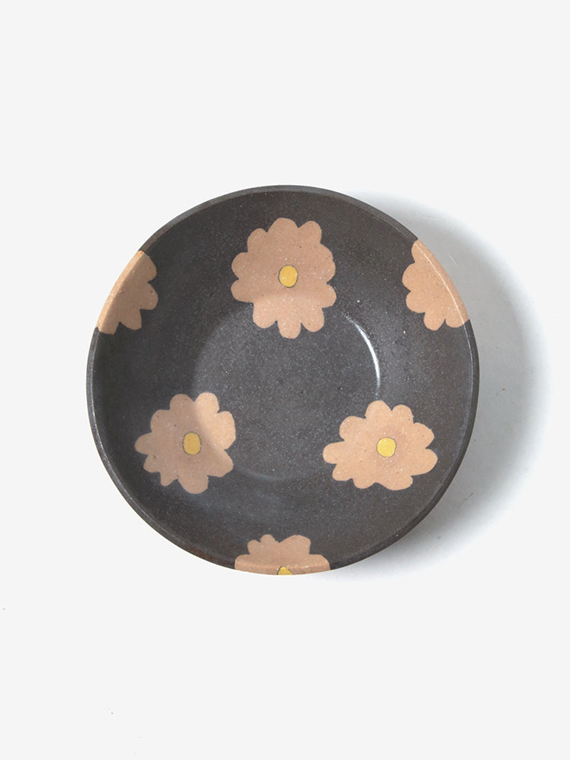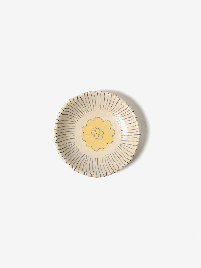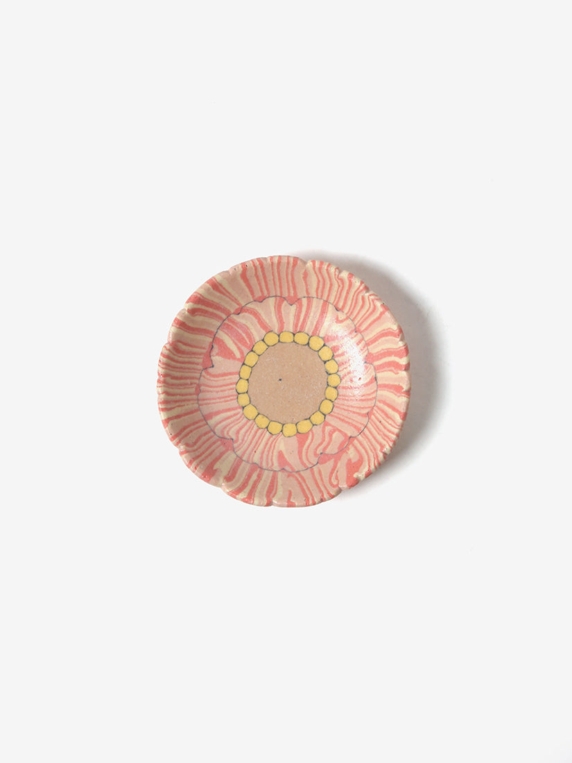「日々の食卓を楽しく彩るうつわ」を目指して製作しています。粘土に顔料を混ぜ、独学の練り込み技法で具体的なモチーフを使うことで、カラフルでポップに仕上げています。製作工程上思った通りに仕上がることは少なく、意図しない模様の揺れや歪みがどこか愛嬌のある表情となって現れます。「大人でも使いたい可愛らしさ」を意識し、図案や色味に配慮しています。