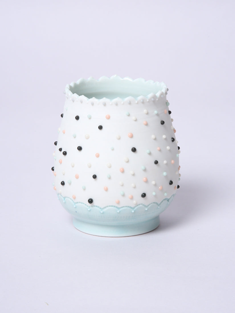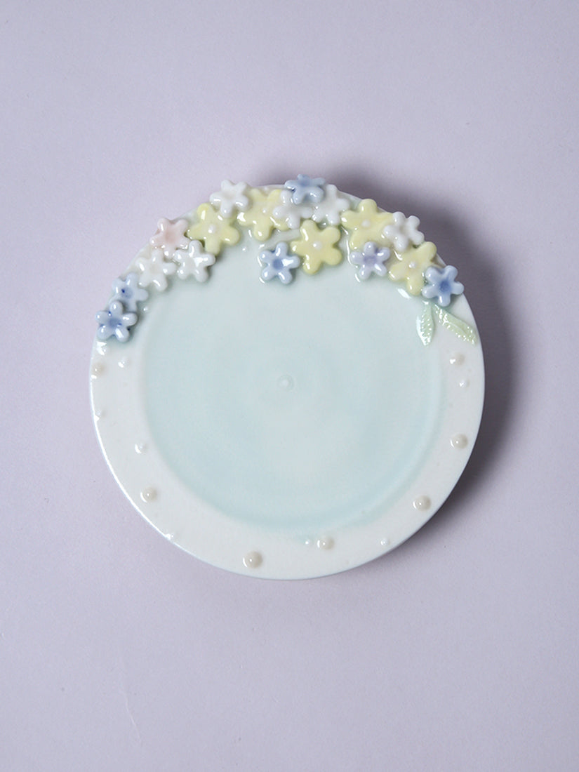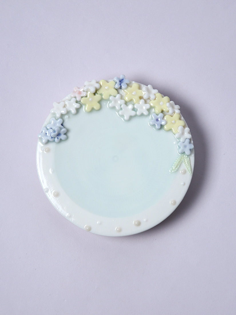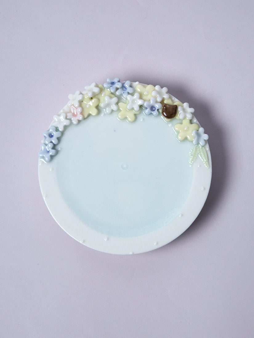 2009年陶芸アシスタントを経て、独立。愛知県常滑にて作陶。2012年神奈川県へ移窯。 様々な種類の土と素材を組み合わせ、雨粒の様なドット、動植物をモチーフに装飾がされた陶器を制作。 雨の時の霞んだ色をパステルで表現しています。 土は、記憶をする性質があり、それに自身の幼少期からの記憶や好きを重ね日々制作しています。